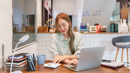 Business concept, Woman entrepreneur working on laptop with calculator in coworking space office