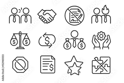 Business concepts illustrated with icons representing teamwork, finance, and agreements in a corporate environment