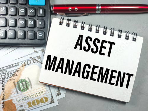 Business concept.Text ASSET MANAGEMENT with pen,banknote and calculator on gray background.