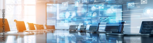 Business conference room with innovative email marketing visuals, highlighting increased reach