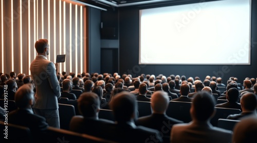 Business conference with speaker addressing a seated audience, modern presentation setup.