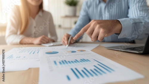 Business consultant pointing to growth forecast on screen with client, sharp detail, professional decor, high-resolution colors
