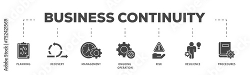 Business continuity icons process structure web banner illustration of management, ongoing operation, risk, resilience, and procedures icon live stroke and easy to edit