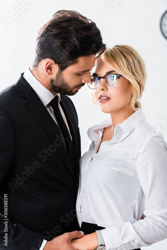 Business couple holding hands while flirting in office