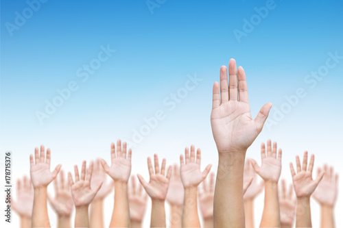 Business crowd raising hands high up on blue skies background. Concept Business / Question / Ask / Idea.