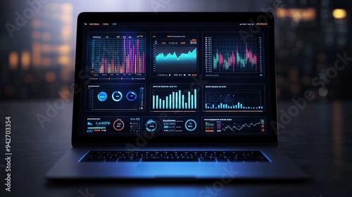 Business dashboard financial management on a 3D laptop with aspects of online business analysis and analytics through applications. Investment, trading and financial management with infographics.