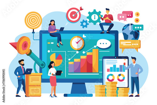 Business Data Analysis, Digital Marketing and Financial Strategy with Teamwork Illustration