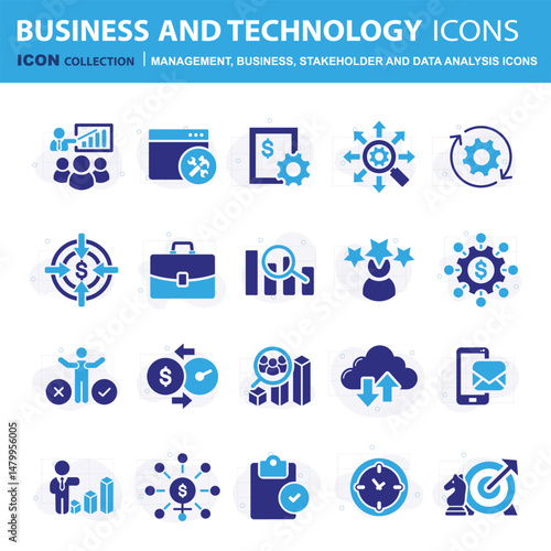 Business, data analysis, organization management and technology icon set. Teamwork, strategy, planning, marketing, cloud technology, data analysis, employee icon set. Icons vector collection