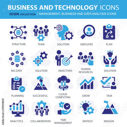 Business, data analysis, organization management and technology icon set. Teamwork, strategy, planning, marketing, cloud technology, data analysis, employee icon set. Icons vector collection