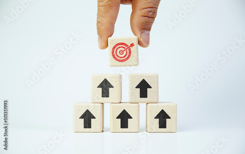 Business development strategies and action plan ideas Hand-crafted wooden block arrangement with business strategy, target icons and arrows flying towards the destination.