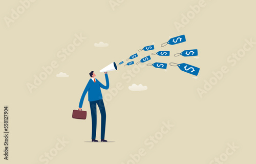 Business development strategy. Discount Pricing Strategies for Businesses. Product price reduction. Businessman holding a megaphone announcing a price drop. Illustration
