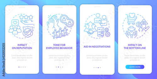 Business ethics advantages blue gradient onboarding mobile app screen. Walkthrough 4 steps graphic instructions with linear concepts. UI, UX, GUI template. Myriad Pro-Bold, Regular fonts used