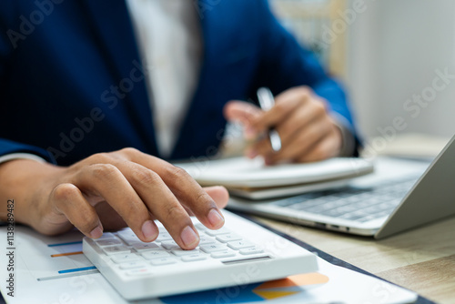 Business finance and budget management, Businessman using calculator and analyzing invoices and tax documents to manage company finances, Budget, Monthly expenses on desk with documents and reports.