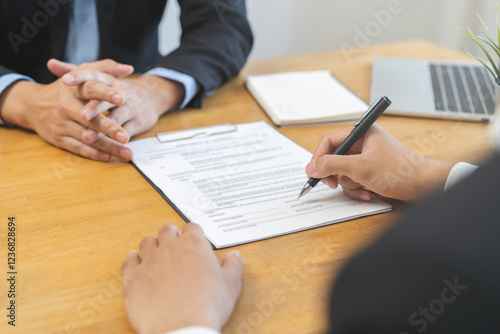 Business finance concept, teamwork and partnership asian businessman customer and salesman discussing client, hand sign sales contract with document at desk office. Lawyers working together at meeting