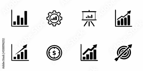 Business Finance Growth Icons Set Charts Graphs Settings Gear Presentation Board Time Clock Target Arrow Money Dollar Sign - Black White Line Art Symbols for Business and Finance Presentations