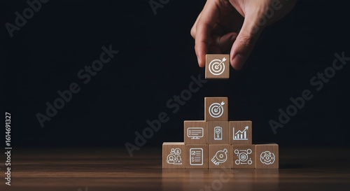Business Goal Achievement Concept: Hand Placing Target Icon on Wooden Blocks