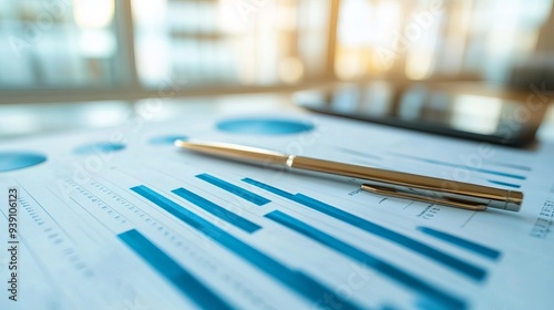 Business graphs and charts laid out on a table representing financial development banking accounts and statistical analysis