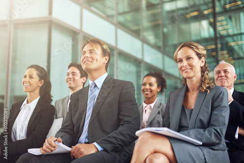 Business, group and seminar listen at an agency with a smile in the audience to learn. Professional, listening and together at a conference to plan a project during a conversation in the company.