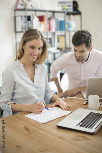 Business group at work. Shot of two young business people sitting in front of laptop and consulting while working on new project. Teamwork.