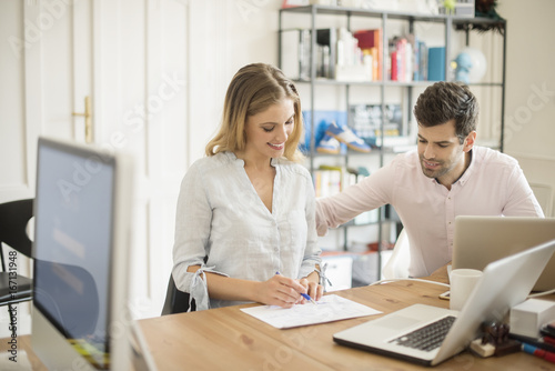 Business group at work. Shot of two young business people sitting in front of laptop and consulting while working on new project. Teamwork.