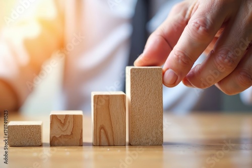 Business Growth and Progress Symbolized by Human Hand Placing Wooden Block in Line