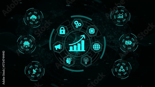 Business Growth Chart Icon within Digital Security Network on Dark Background analytics data