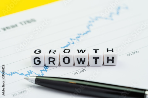 Business growth or return increase in investment concept, cube block building the word Growth on high positive chart and graph with pen