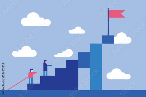 Business growth, staircase to success, reaching goals, blue gradient steps, red flag at peak, minimalist figures, teamwork, leadership, progress visualization, cloud icons, pixel art style, corporate
