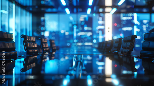 Business hall for conferences and negotiations in a skyscraper, in blue colors. Large glass table, leather chairs, ultra modern design. Discussion of the investment.