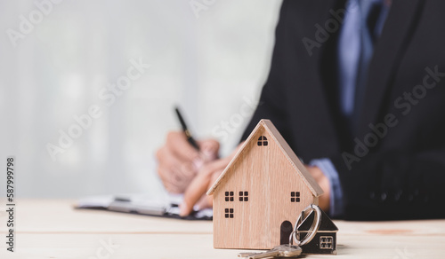 Business hand holding home with Buy or Rent, copy space. Property investment and house mortgage financial concept, Hand putting money coin stack with wooden house.