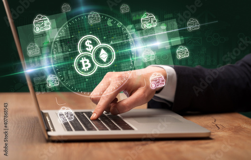 business hand working in stock market with cryptocurrencies icons coming out from laptop screen