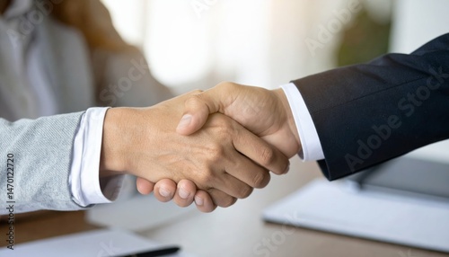Business handshake between professional individuals in an office setting, symbolizing partnership and collaboration in the workplace