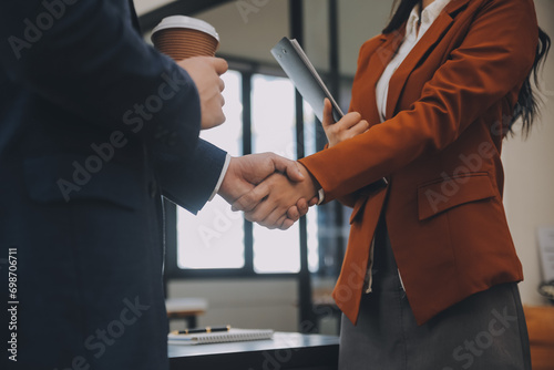 Business handshake for teamwork of business merger and acquisition,successful negotiate,hand shake,two businessman shake hand with partner to celebration partnership and business deal concept