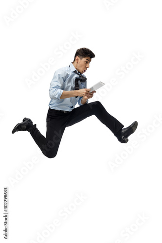 Business. Happy young man dancing in casual clothes or suit, remaking legendary moves and dances of celebrity from culture history. Isolated on white. Action, motion, fame concept. Creative occupation