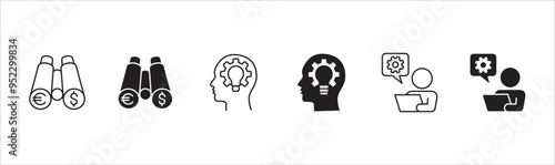 Business icon set. Contains icon or symbol of strategy, research, discussion, plan, idea, option, binocular, brain storming. Vector illustration in thin line and flat solid design.