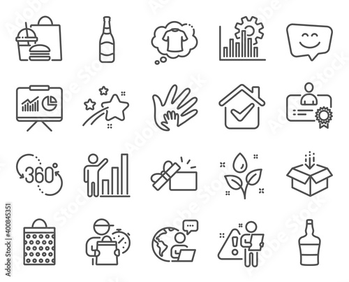 Business icons set. Included icon as 360 degree, T-shirt, Beer bottle signs. Seo graph, Plants watering, Presentation symbols. Certificate, Opened gift, Scotch bottle. Shopping bag. Vector