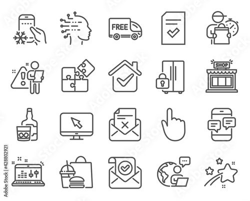Business icons set. Included icon as Free delivery, Refrigerator app, Refrigerator signs. Phone messages, Sound check, Internet symbols. Shop, Artificial intelligence, Checked file. Puzzle. Vector