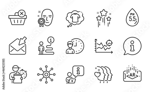 Business icons set. Included icon as Multichannel, Open mail, T-shirt signs. Seo analysis, Friends couple, Augmented reality symbols. Stars, Delivery man, Face verified. Working hours. Vector