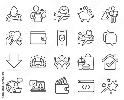 Business icons set. Included icon as Ranking, Flight time, Phone protection signs. Arena stadium, Messenger, Water splash symbols. Saving money, Money wallet, Downloading. Hold heart. Vector