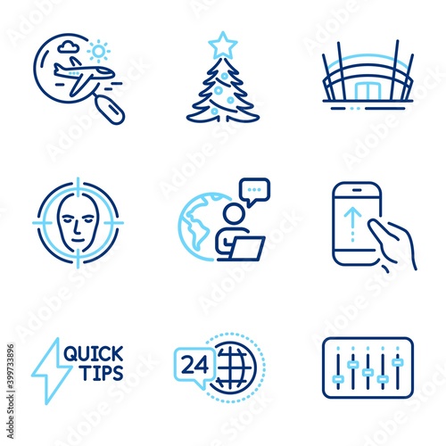 Business icons set. Included icon as Swipe up, Dj controller, Face detect signs. Arena stadium, Search flight, Quickstart guide symbols. 24h service, Christmas tree line icons. Line icons set. Vector