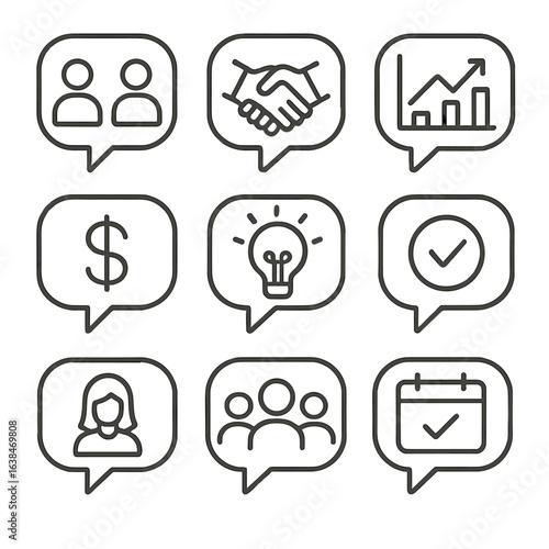 Business Icons Speech Bubbles. Outline style icons of Business Use Speech Bubbles: meeting chat bubble, collaboration icon bubble,