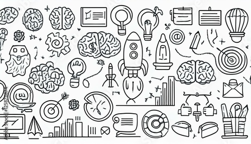 Business idea, startup doodle line icon set. Hand drawn doodle sketch line style business strategy, finance goal concept. Rocket, target, brain cute element. perfect any project.