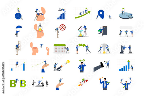 Business illustrations set. Collection of scenes with men and women taking part in business activities.