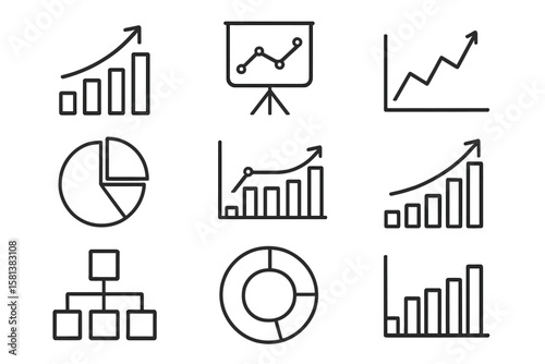 Business infographic charts and diagram icons for web and mobile apps, including statistics, growth, bar graphs, pie charts, line charts. Transparent background vector illustration