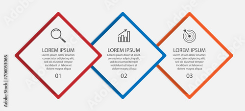 business infographic design 3 parts or steps containing icons, text and numbers, square designs and thin colored lines that are interconnected, for workflow diagrams, banners and your business