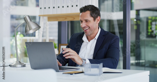 Business, laptop and smile with accountant man at desk in office for financial audit or review. Computer, bookkeeping and finance with happy employee person in workplace for revenue analysis
