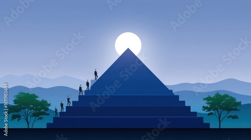 Business Leaders Climbing Pyramid Under Sunrise Background