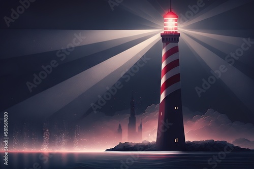 Business leadership and vision concept. Lighthouse in the city, emitting rays of light