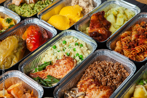 Business lunch in eco plastic container ready for delivery.Top view. Office Lunch boxes with food ready to go. Food takes away. Catering, brakfast.