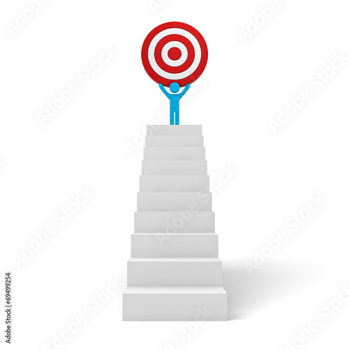 Business man holding dartboard target on top of stair on white